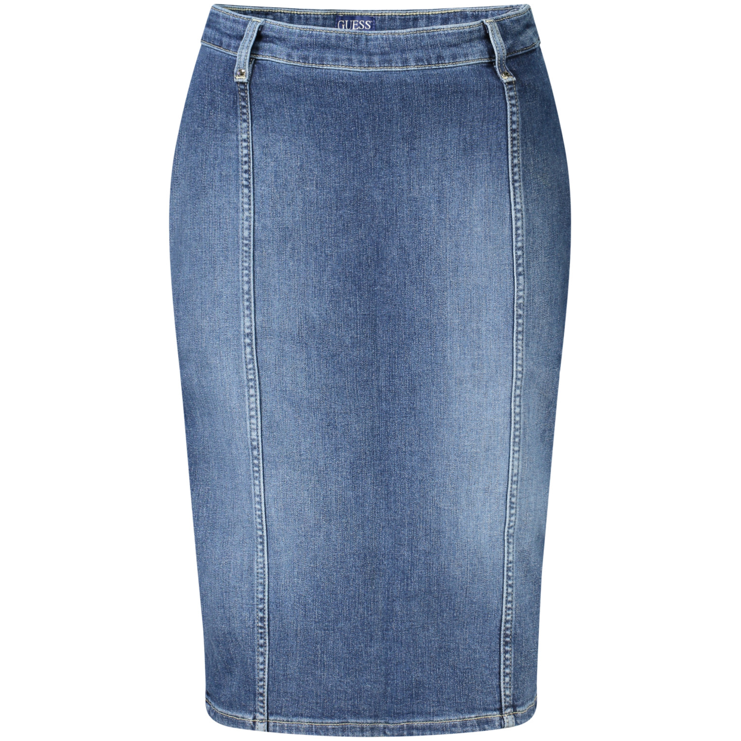 GONNA LONGUETTE IN JEANS, EFFETTO SLAVATO, 2 TASCHE POSTERIORI, SPACCO, CERNIERA LATERALE, LOGO, RECYCLED COTTON
